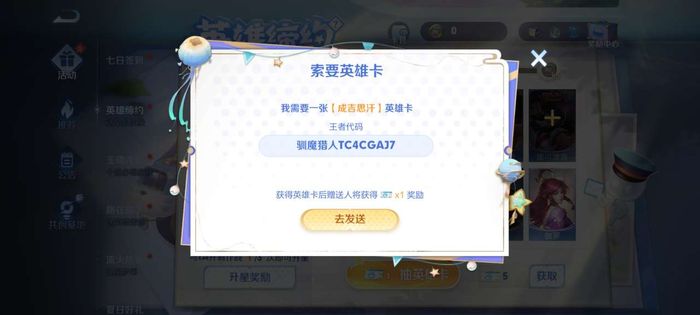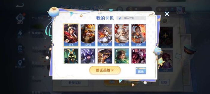 而如果大家有些英雄卡牌抽不到的話,就可以點(diǎn)擊這里面的缺失英雄卡,就會(huì)看到有一個(gè)代碼出現(xiàn),小伙伴可以點(diǎn)擊去發(fā)送,給有這個(gè)卡的玩家,讓他們給我們這張卡,從而可以快速完成任務(wù),而送我們卡的人還可以獲得一張抽卡券,等于是雙贏了。