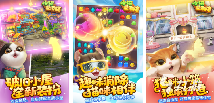 在小貓愛消除游戲中,在傳統(tǒng)三消基礎(chǔ)上加以創(chuàng)新,引入了貓咪專屬的“特殊技能”,當四個及以上相同貓咪方塊連成一線時,不僅能實現(xiàn)常規(guī)消除,還會觸發(fā)貓咪的獨特能力,比如有的貓咪會釋放一道彩虹光波,消除一橫排或一豎排的所有方塊,有的貓咪能召喚出一群小魚干,吸引周圍同色方塊自動聚集合并,大大增加了消除的趣味性與策略性。
