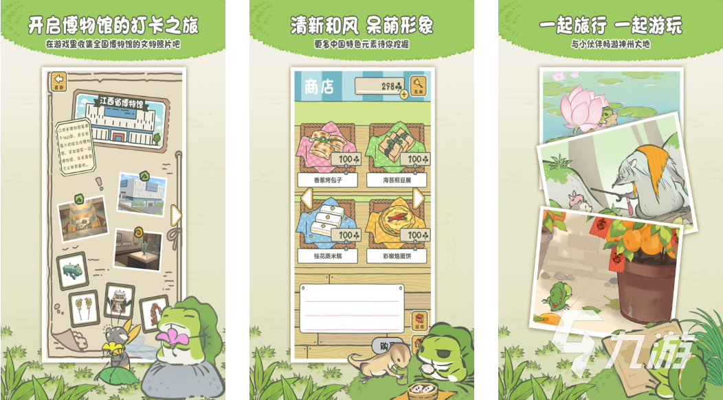 各位在這里每天都會與一只特別可愛的青蛙生活,你不僅需要照顧青蛙的飲食起居,還要陪伴它學習。其中最有趣的就是小青蛙會到處旅游,在旅游的過程中所需的食物和裝備都需要收集,通過獲得的三葉草進行兌換。蛙蛙們遇到好看的風景還會拍照留戀,或者買一些好看的紀念品帶回來給你。此外,你在游玩此款游戲的同時還能實現(xiàn)足不出戶就能觀看中國各處的風景。
