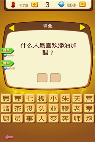 《全民猜燈謎2015》是一款以腦筋急轉(zhuǎn)彎為主的猜字謎的游戲。闖關(guān)答題,對(duì)于喜歡這種類型游戲的小伙伴來(lái)說(shuō),可以從游戲中體驗(yàn)猜燈謎的樂(lè)趣,喚起童年的美好回憶。題目有一定的難度系數(shù),值得大家去挑戰(zhàn)!