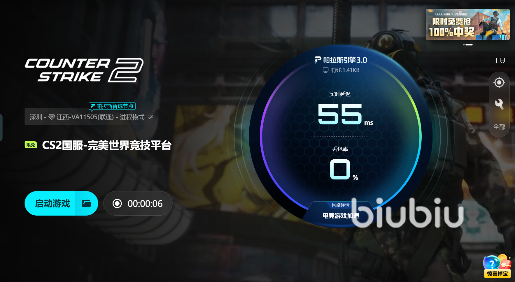 操作上也非常簡單。打開biubiu客戶端,選csgo加速,點擊開啟即可。系統(tǒng)會自動完成線路匹配與優(yōu)化,不需要玩家手動設(shè)置。后臺占用極低,不會拖慢CPU或幀率,也不會影響游戲畫面。幾秒鐘后網(wǎng)絡(luò)通路被打通,延遲下降、丟包消失。無論是進入大廳、加載地圖還是匹配服務(wù)器,都能感受到明顯提速。