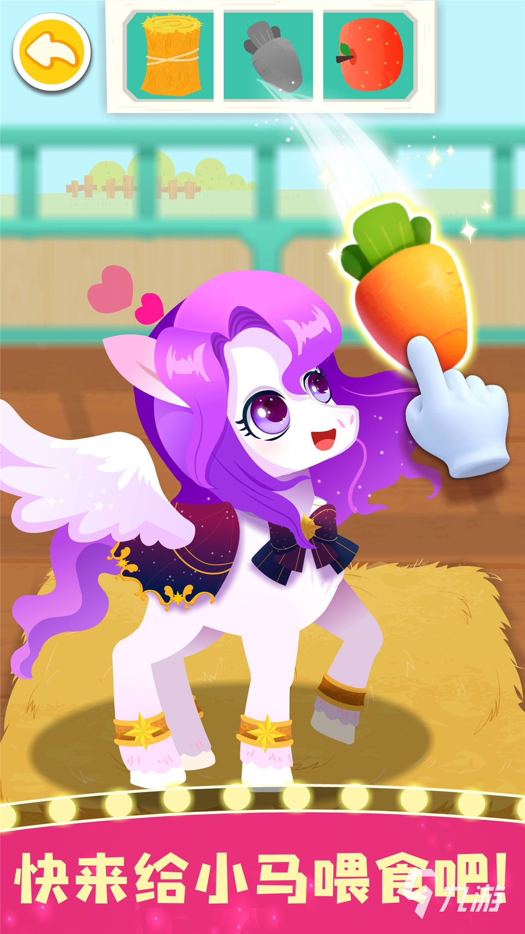 馬匹的培養(yǎng)離不開對小馬的喂食,游戲在馬匹喂食方面做得特別細致,有大量食物供玩家自由挑選,如,胡蘿卜,玉米,小麥餅干等等。玩家需要根據(jù)食物營養(yǎng)進行搭配,然后才能喂食小馬。對小馬合理的喂食可以提升小馬的能力值。在喂食完小馬后,玩家還需要對小馬進行清潔,清理步驟清晰,先用刷子刷下小馬身上的塵土,然后用水將小馬身上沖干凈。保證小馬身上的潔凈可以讓小馬心情舒暢,讓能力值不下降。