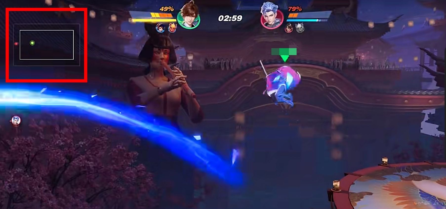 星之破曉中不顯示血量,而是擊飛值,你受到的攻擊越多,擊飛值越高,擊飛值高可不是什么好事,這意味著你非常危險。如果對手把你擊出界外,你就輸了(左上角有邊界示意圖)。擊飛值達一定程度,對手可以一擊必殺。