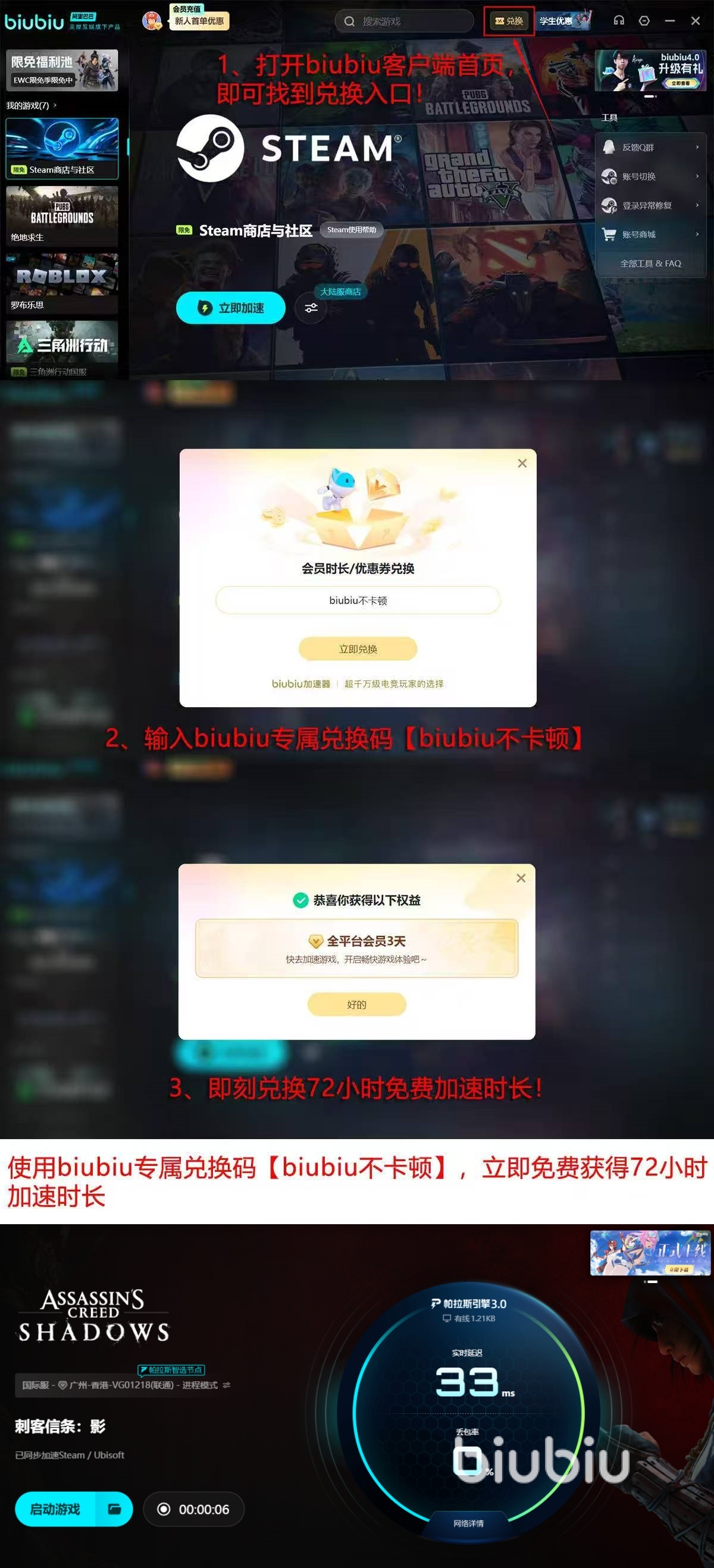 而且現(xiàn)在去使用的朋友還有許多超值福利給到,新用戶在第一次登錄時,能獲贈到為期24h加速,如果說各位到時希望能領(lǐng)取到更多加速機會,那么主動點擊兌換,去輸入【biubiu不卡頓】,如此也能讓小伙伴們成功解鎖72H加速,這樣就能長時間運行游戲,不用顧慮會出現(xiàn)要求充值等方面狀況發(fā)生。