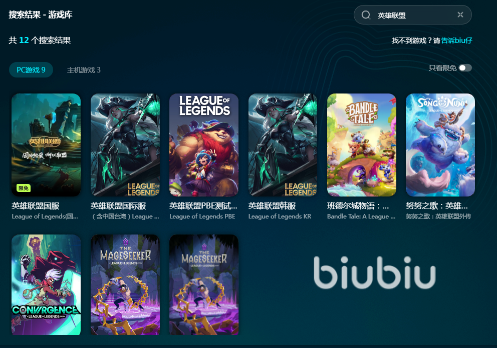 用biubiu加速器可以免費(fèi)提升lol下載速度和免費(fèi)加速游戲,目前平臺(tái)開放了英雄聯(lián)盟的限免加速,里面還有除了lol國(guó)服以外其余多款lol系列游戲。大家如果有其他想玩的游戲也可以動(dòng)動(dòng)小手搜一搜,相信biubiu不會(huì)讓大家失望的,它的資源庫(kù)超級(jí)強(qiáng)大,能夠加速全球上萬(wàn)款游戲。
