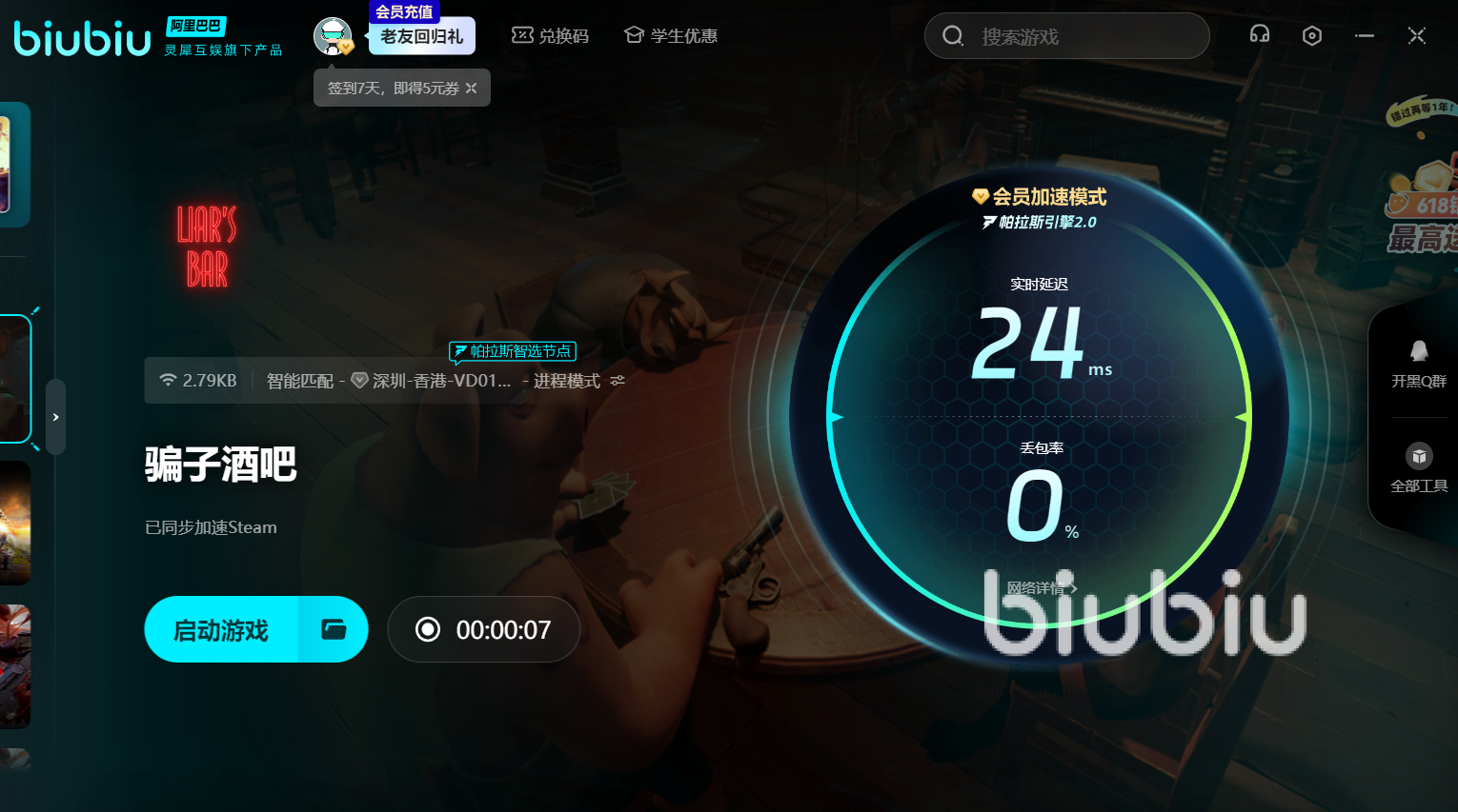 騙子酒吧作為一款可在全球范圍內(nèi)參加對(duì)局的國(guó)際大作,目前暫時(shí)沒(méi)有上線國(guó)服。為了能夠與全球玩家一同競(jìng)技,建議用上biubiu,加速后才有資格進(jìn)入酒吧參加賭局。對(duì)于剛注冊(cè)的新人來(lái)說(shuō),就能馬上享有24小時(shí)的免費(fèi)加速。另外新老用戶輸入兌換碼【biubiu不卡頓】,就能額外領(lǐng)取三天免費(fèi)加速。大家在選擇角色時(shí)延遲高的話,可能就會(huì)選錯(cuò)角色,從而影響最終的結(jié)局。建議使用加速器,才能在倒計(jì)時(shí)前選好角色。