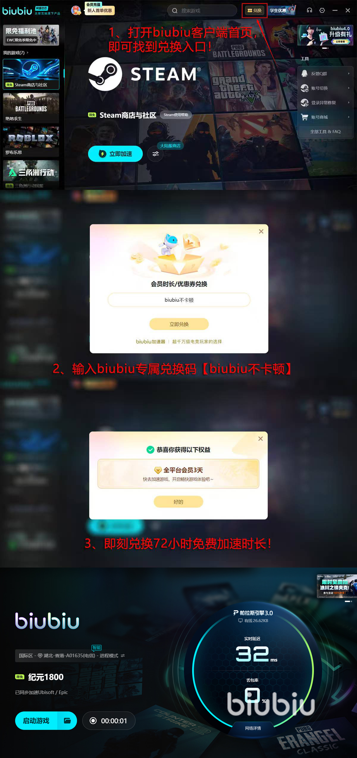 biubiu提升功能的同時,非常注重用戶體驗(yàn)感受。邀請了電競冠軍Aixleft一起參與用戶體驗(yàn)提升,官方開啟多個活動邀請大家一起體驗(yàn)。有新戶注冊就送免費(fèi)24小時的加速福利,同時,所有用戶還可參加一次【biubiu不卡頓】口令活動,用該口令可在首頁兌換72小時福利,當(dāng)然,這兩個活動新手玩家都可以參與,時間可疊加最高96小時。