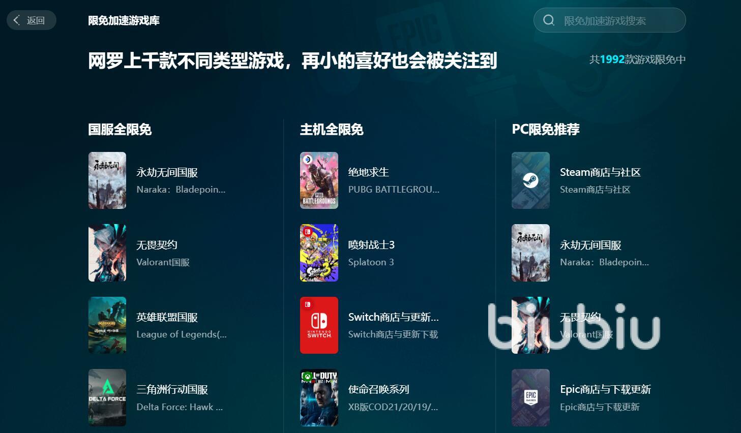 大多數(shù)用戶平常主要還是在電腦上玩,這時就免不了要用steam,你能在steam買到各種類型的大作,基本能滿足大部分玩家的需求,你可以從中輕松找到自己愛玩的大作。應(yīng)用中還會定時推出一些活動去進行打折促銷,讓你能用低價買到自己想玩的作品。不過steam有一個很大的問題,那就是用起來老是卡頓,特別是在沒有專業(yè)軟件優(yōu)化的狀態(tài)下,有時候連界面都加載不出來,就更談不上使用了。針對這個問題,biubiu當(dāng)中打造了多個入口,你可以根據(jù)自己實際的情況,選擇對應(yīng)的功能去使用。