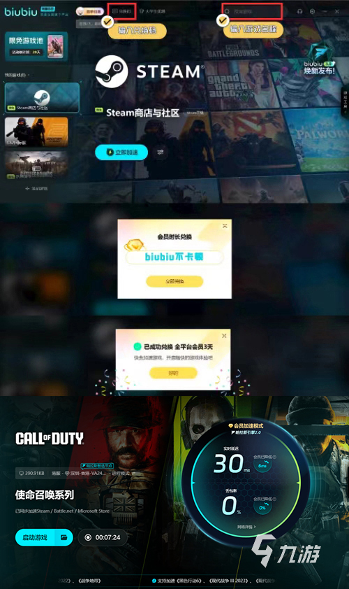 為了讓新老用戶快速熟悉平臺,biubiu推出了試用的福利,新用戶第一次登陸直接獲得一天免費時間,隨意挑選游戲庫的任何一款游戲加速,從此告別游戲卡頓、延遲、黑屏、閃退等,讓使命召喚21畫面非常流暢,確保游戲中不會出現(xiàn)意外。
