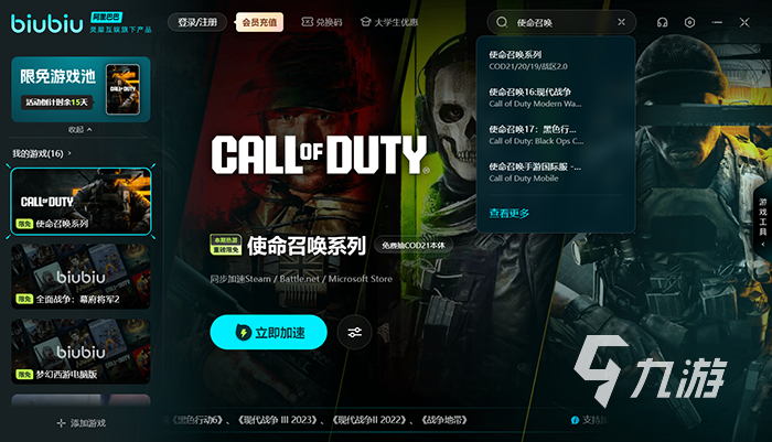 此外,biubiu還搭建了限時免費專區(qū),為一些主機游戲、國內(nèi)端游等免費加速。目前,biubiu特別福利上線,整個使命召喚系列限時免費體驗加速,在10月24日至11月8日。