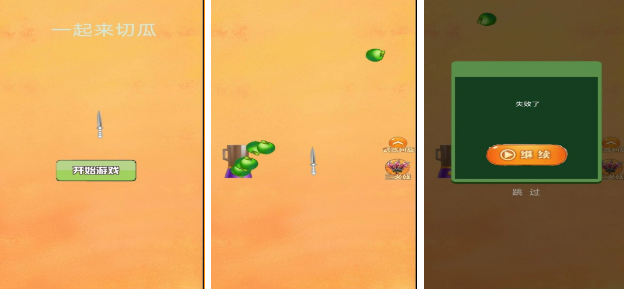 《一起來切瓜》里并沒有人物的存在,玩家們要是用飛刀來切西瓜等水果,這款游戲制作的相對簡單,像是一款很簡約的解壓游戲,每一個關卡里都會出現(xiàn)很多的水果,玩家們要發(fā)射出飛刀將這些水果統(tǒng)統(tǒng)切開,獲得了一些分數(shù)就可以通關了,隨著關卡的深入,那么難度會有一定的提升。