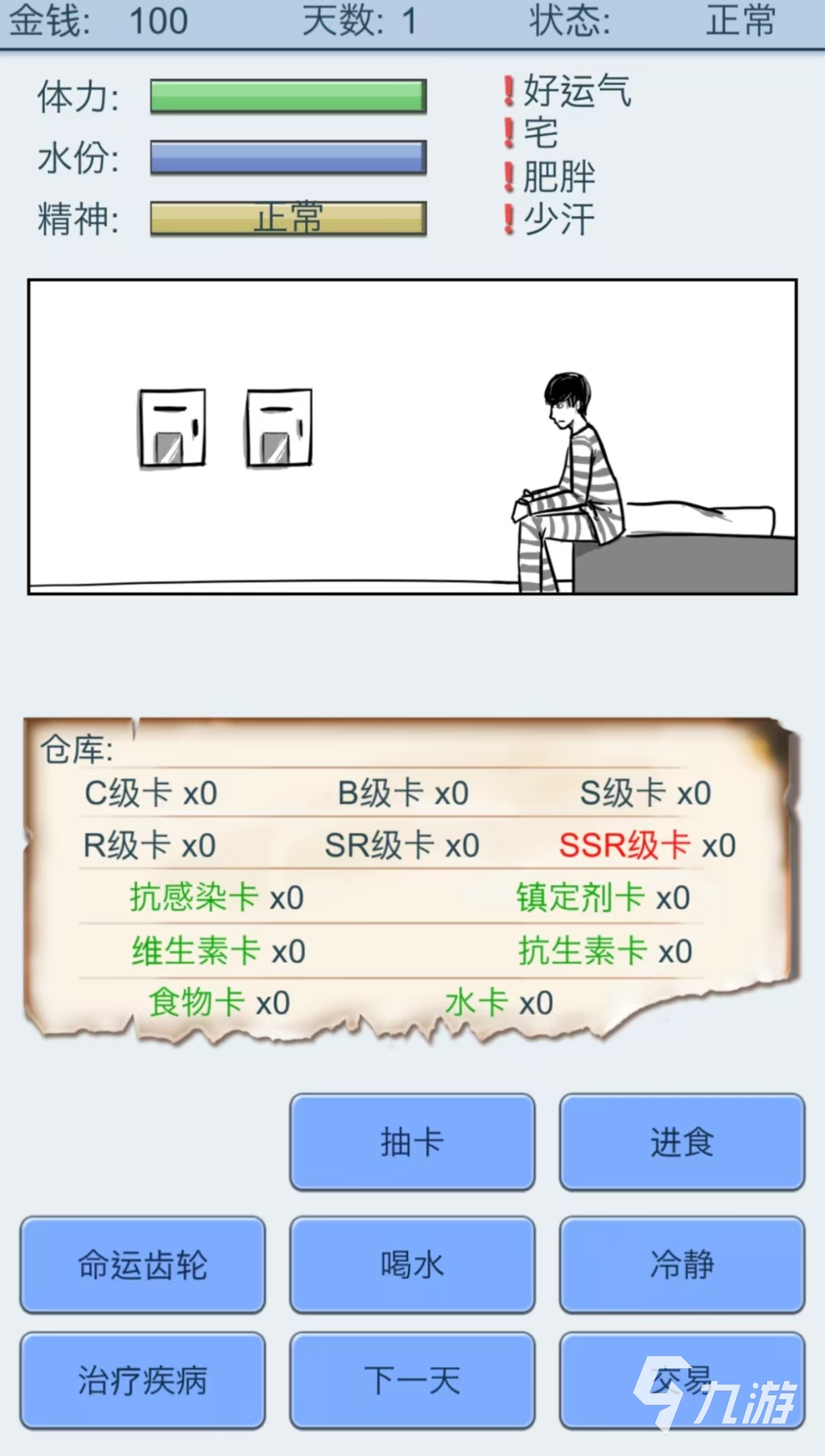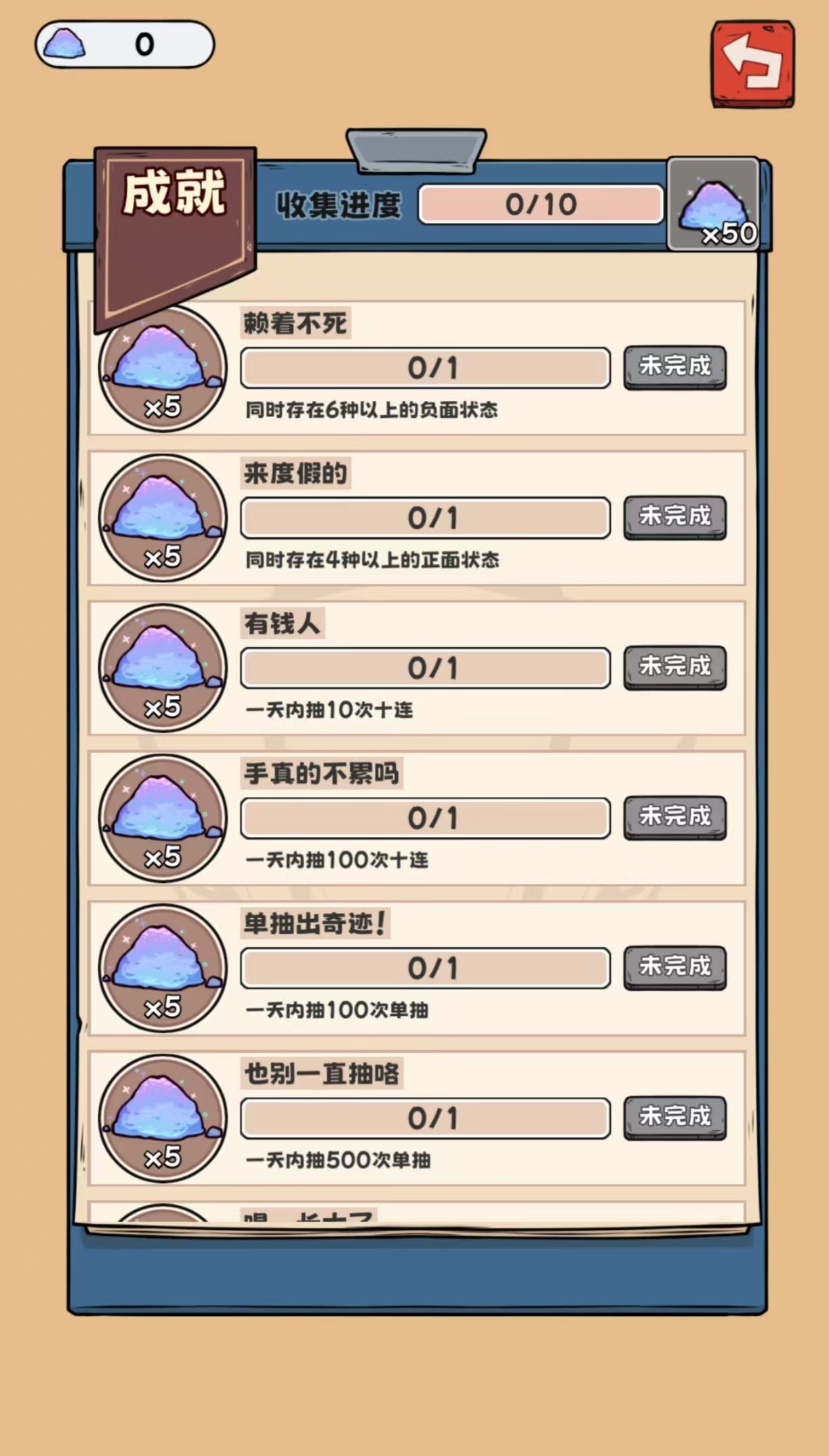 《抽卡人生》游戲內(nèi)創(chuàng)造了一個非常惡劣的環(huán)境,將采用不斷抽卡的方式進行挑戰(zhàn),會獲得一個隨機的角色經(jīng)歷,出生時會自帶4個隨機的天賦。玩家所需要的一切都需要通過抽卡,吃的食物和衣服都需要抽卡獲得,需要不斷的抽取食物,不然角色會餓死。每天給玩家提供一定的金幣,可以用來抽取非常多的卡牌,可以在游戲內(nèi)把卡牌進行交易,可以自由改變卡牌的價格。