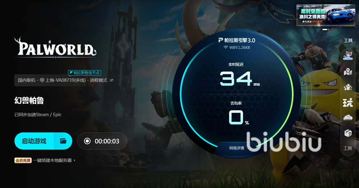 在游戲中玩家可以捕捉超過100種不同類型的帕魯,利用它們的獨(dú)特技能和屬性去進(jìn)行戰(zhàn)斗以及建設(shè)等各種操作。游戲中實(shí)現(xiàn)了物品搜集、植物種植、自動(dòng)化發(fā)電等系列設(shè)計(jì),給大家?guī)砹朔浅3錾哪M建造經(jīng)歷。在戰(zhàn)斗方面,玩家還可以使用各種武器,和帕魯一起去挑戰(zhàn)野外boss。因?yàn)橛螒蜷_放了聯(lián)機(jī)模式,最多支持32人同時(shí)進(jìn)行聯(lián)機(jī),再加上游戲本身在線人數(shù)非常高,所以很多時(shí)候就容易出現(xiàn)卡頓延遲等問題。今天小編推薦的biubiu加速器,就可以很好解決這些問題。