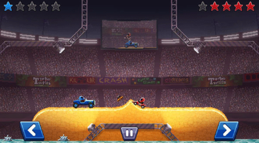 亮點在于種類繁多的賽車與豐富的裝備選項,玩家可以安裝出獨一無二的帥氣賽車。操作界面簡潔明了,左側控制賽車方向,右側則負責前進與后退,能夠輕松上手,而玩法極富娛樂性,玩家需巧妙把握時機,將對手車輛撞下平臺,驅逐出比賽場地。在像素風格的戰(zhàn)場上,只需簡單操控賽車,便能體驗賽車競技的精彩。