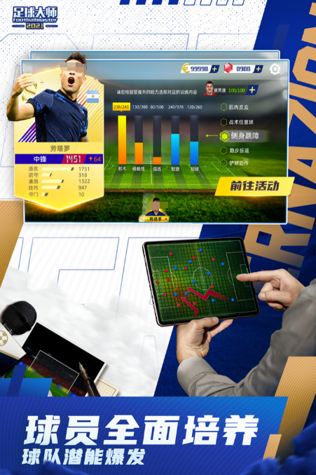 玩家要化身為一位真正的足球教練,肩負起培養(yǎng)和訓練球員的重任,助力他們邁向更高峰。游戲內(nèi)的訓練系統(tǒng)科學且富有挑戰(zhàn)性,需要玩家精心規(guī)劃球員的訓練計劃,以提升他們的綜合實力。游戲中的球場呈現(xiàn)出極致的真實感,光影效果隨時間而變化,營造出逼真的比賽氛圍。想要帶領自己的隊伍贏得勝利,就需要玩家運籌帷幄,制定出克敵制勝的戰(zhàn)術策略。