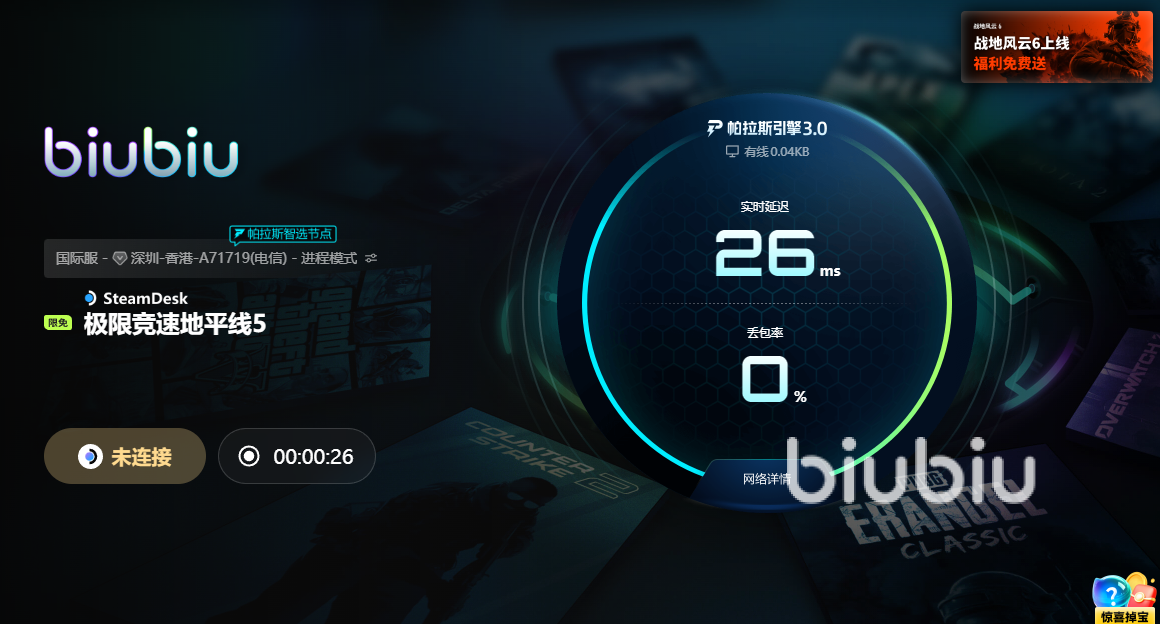 特別是當(dāng)遇到一些特殊的問題時,biubiu自研的一些技術(shù)手段還能輕松解決,比如服務(wù)器在線高峰排隊嚴重時,在游戲中時會有掉線嚴重的情況,biubiu就會提供更多的加速通道,通過同步發(fā)送數(shù)據(jù)的方式,確保數(shù)據(jù)傳遞的及時性,而為了穩(wěn)定客戶端的網(wǎng)絡(luò),biubiu將引入的帕拉斯引擎技術(shù)升級至3.0系統(tǒng),結(jié)合自研的智能系統(tǒng)對網(wǎng)絡(luò)進行智能調(diào)整,實現(xiàn)動態(tài)平衡,保證游戲不會因丟包出現(xiàn)各種問題。