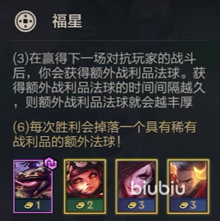 在這個玩法當(dāng)中,我們得到福星棋子之后,每次贏得下一場戰(zhàn)斗的時候,就會得到額外的戰(zhàn)利品法球,法球獲取間隔的時間越久,積累的戰(zhàn)利品就更豐厚。想要得到這些獎勵,有哪些棋子我們要先弄清楚。