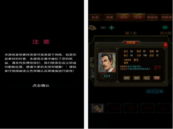 游戲中的玩家,既可感受三國(guó)的諸多英雄,還在大家熟悉的背景當(dāng)中,又融入了戰(zhàn)棋玩法,利用兵種以及技能等各種方面的搭配,在每次闖關(guān)的時(shí)候,將所有的敵人打敗。不僅在玩法上比較簡(jiǎn)單,整體的畫面也是很獨(dú)特的,以簡(jiǎn)約的黑色背景進(jìn)行設(shè)計(jì),通過(guò)對(duì)每一個(gè)武將武力值以及智力等,各方面升級(jí)的方式,組建強(qiáng)大的隊(duì)伍,利用技能戰(zhàn)勝對(duì)手。