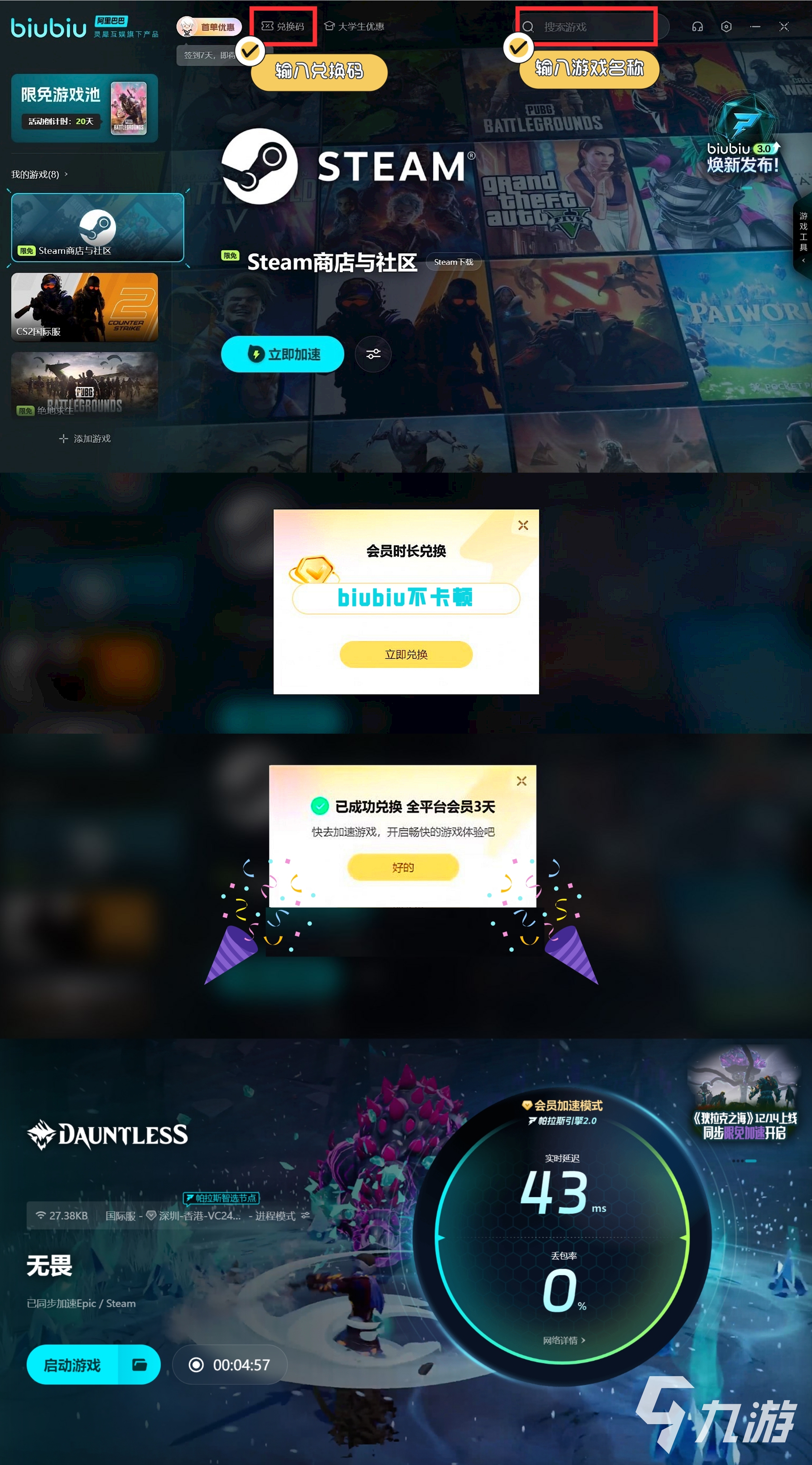 而有部分玩家是由于聯(lián)機的環(huán)境太糟糕了,導(dǎo)致進圖容易出現(xiàn)頻繁地崩潰,這樣就使用biubiu加速器進行加速,讓崩潰問題徹底消失,并且新人在注冊后便獲3小時免費加速,新老用戶均可使用兌換碼【biubiu不卡頓】可獲3天免費的使用權(quán)哦!