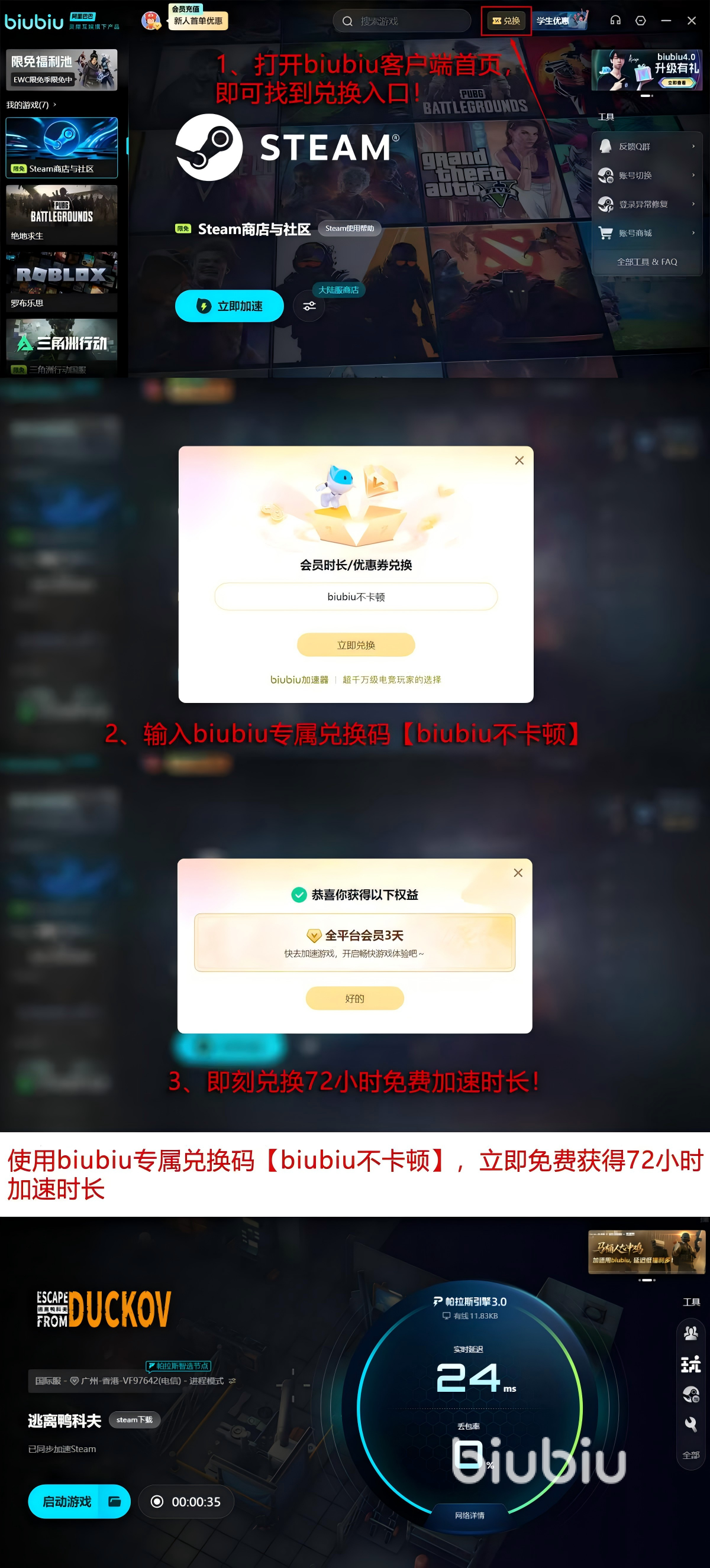 而且,在福利回饋這方面,它做的一直都是非常給力的,如今廣大新用戶只需點(diǎn)擊登錄進(jìn)入就能順利的領(lǐng)取到為期24H的加速試用機(jī)會(huì),若是大家希望能解鎖更多加速時(shí)長(zhǎng),那么僅僅只需點(diǎn)擊首頁上方的兌換按鈕,在借助【biubiu不卡頓】口令就能領(lǐng)取到為期72小時(shí)的加速福利哦。