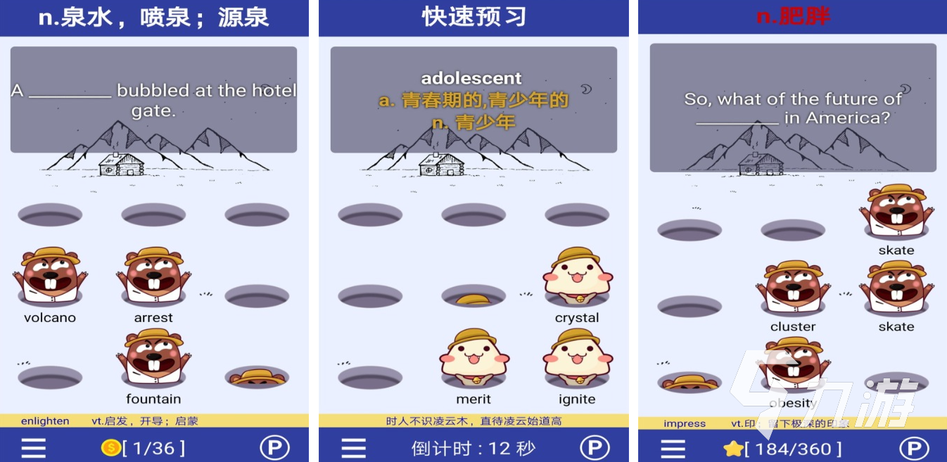 通過打擊頭頂上顯示詞匯的地鼠,這樣的話就能夠盡快的幫助玩家了解對應單詞的用法跟具體的含義。而整個游戲如果單純的就憑借這些特色,吸引眾多玩家,那就大錯特錯。了,因為游戲主要是通過視覺聯(lián)想,不斷的去強化記憶效果,能夠讓玩家每天花費20分鐘,就能夠輕輕松松背很多的單詞,因為整個游戲地屬動畫跟靈動界面,讓玩家的興趣大增,不過在選擇使用單詞的時候也需要合理的運用。
