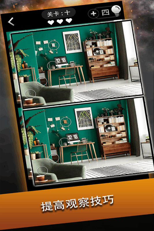 看圖找不同這是一款經(jīng)典益智找不同游戲,游戲關(guān)卡豐富,含有多達(dá)一千道關(guān)卡。游戲中沒(méi)有規(guī)定時(shí)間,玩家們需要在兩張精美的圖片中找出九處不同的地方。