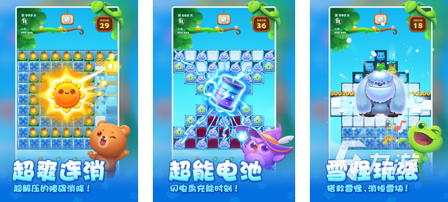 每一關(guān)卡的參與小動物的樣式都相同,根據(jù)任務(wù)的不同,數(shù)量也會有所差別,在相處過程中,游戲會設(shè)定可愛風(fēng)格的障礙物,比如冰塊和Q彈毒液,同時也會放置一些技能比較炫酷的動物,彩色貓頭鷹與任意一個小動物交換就可以吸收頁面所有該類型動物。隨著關(guān)卡的升級,超能電池的特效技能將玩家?guī)肷{(diào)純粹的炫酷世界。