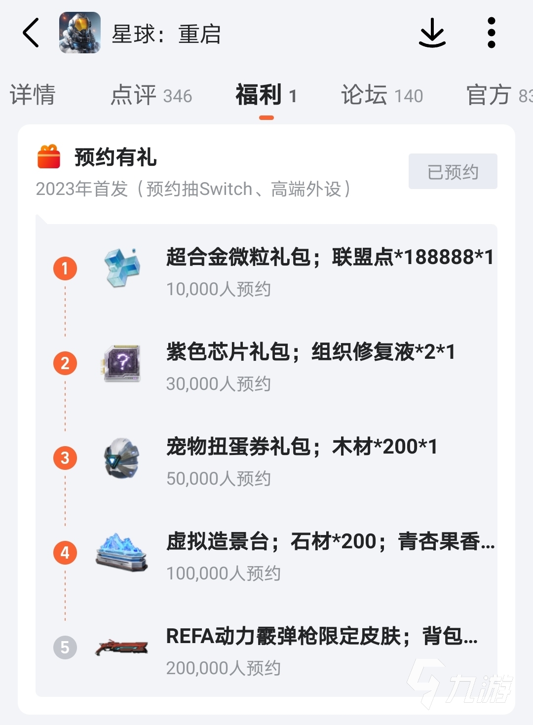 相比其他平臺(tái)的預(yù)約獎(jiǎng)勵(lì),九游平臺(tái)的豐富了不少,并且除此之外官方還有留言、發(fā)帖抽獎(jiǎng)之類的活動(dòng),大家可以多關(guān)注一下各下載平臺(tái)的動(dòng)向,說(shuō)不定中獎(jiǎng)的就是你,為自己今后在星球重啟游戲中多累積點(diǎn)資源。