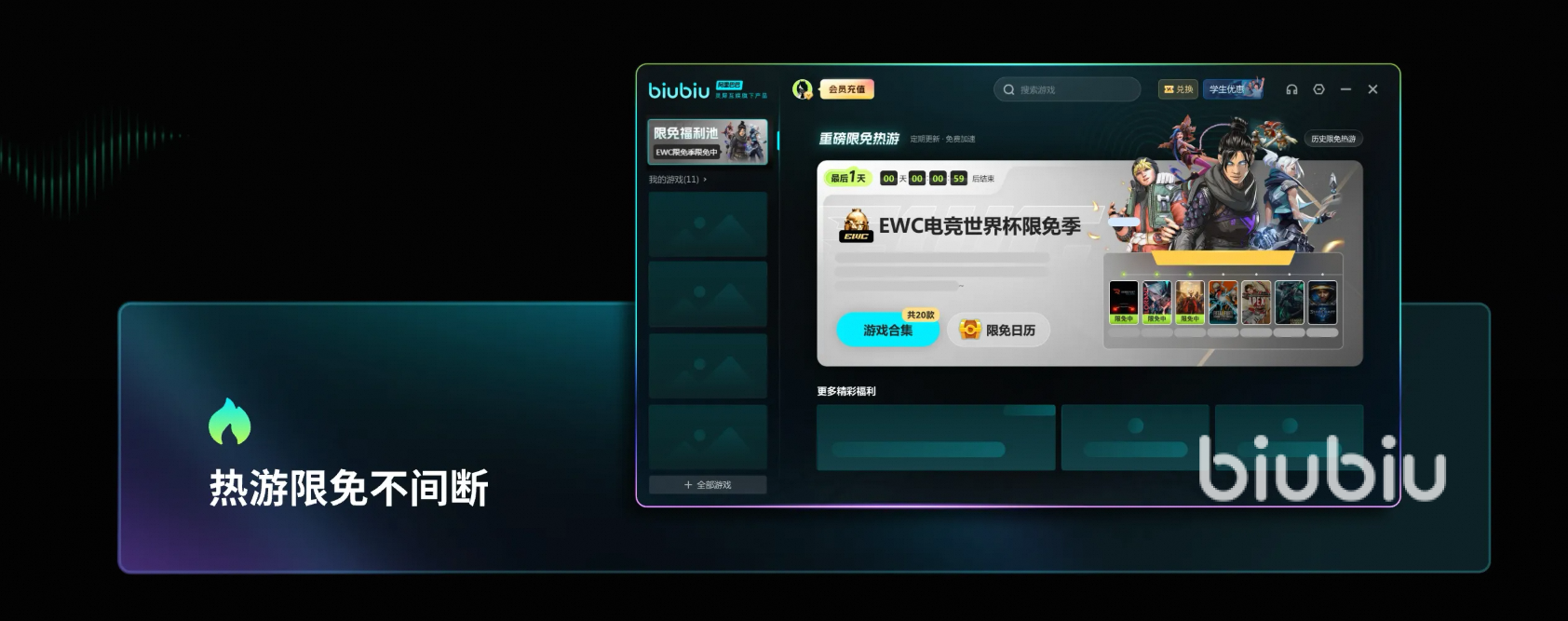 此次biubiu的升級是與冠軍選手Aixleft合力打造,通過長期的實戰(zhàn)測試,驗證新biubiu可以帶給大家更加穩(wěn)定、高效和持久的游戲加速效果。Biubiu也為小伙伴們準備免費體驗機會,如新注冊用戶現(xiàn)在直接有24小時福利,新玩家和老玩家若使用【biubiu不卡頓】口令,還可以在客戶端領到72小時福利時間,上述活動中,新人都可參加,若同時參與時間直接累積到96小時。與此同時,到8月24日結束的biubiu暑期限免活動,現(xiàn)在仍有千款游戲正在限免,每天可在客戶端專題欄目查看限免游戲名單。