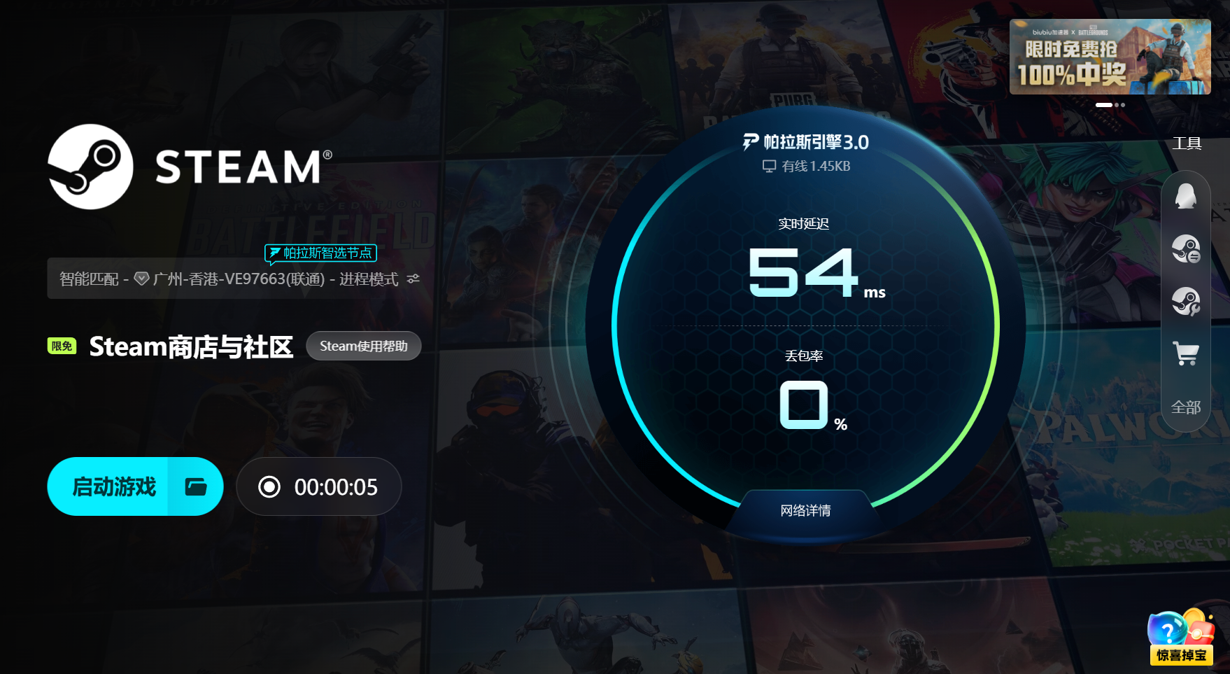 解決這種問題不能只靠重裝或清緩存,根本得從網(wǎng)絡入手。biubiu加速器可以直接優(yōu)化Steam通道,通過通用加速功能重建連接路徑,讓數(shù)據(jù)傳輸更短更穩(wěn)。它會繞過擁堵節(jié)點,減少丟包和延遲,讓客戶端與服務器保持順暢通信。連接一穩(wěn),閃退自然減少。新用戶注冊即可領取二十四小時免費加速時長,在客戶端首頁輸入口令【biubiu不卡頓】還能額外領取七十二小時。幾天的使用就足夠覆蓋游戲下載、啟動、更新等所有階段,避免閃退反復出現(xiàn)。