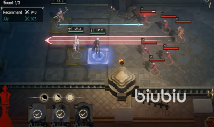 PVE闖關(guān)通常分成2-3個(gè)回合,玩家在每個(gè)回合開始前可優(yōu)化陣容,最多進(jìn)行3次行動(dòng),如上陣新角色或?yàn)橐焉详嚱巧遣?qiáng)化技能。BOSS戰(zhàn)單回合給予玩家9次行動(dòng)機(jī)會(huì),玩家需通過合理布陣與升星來應(yīng)對。
