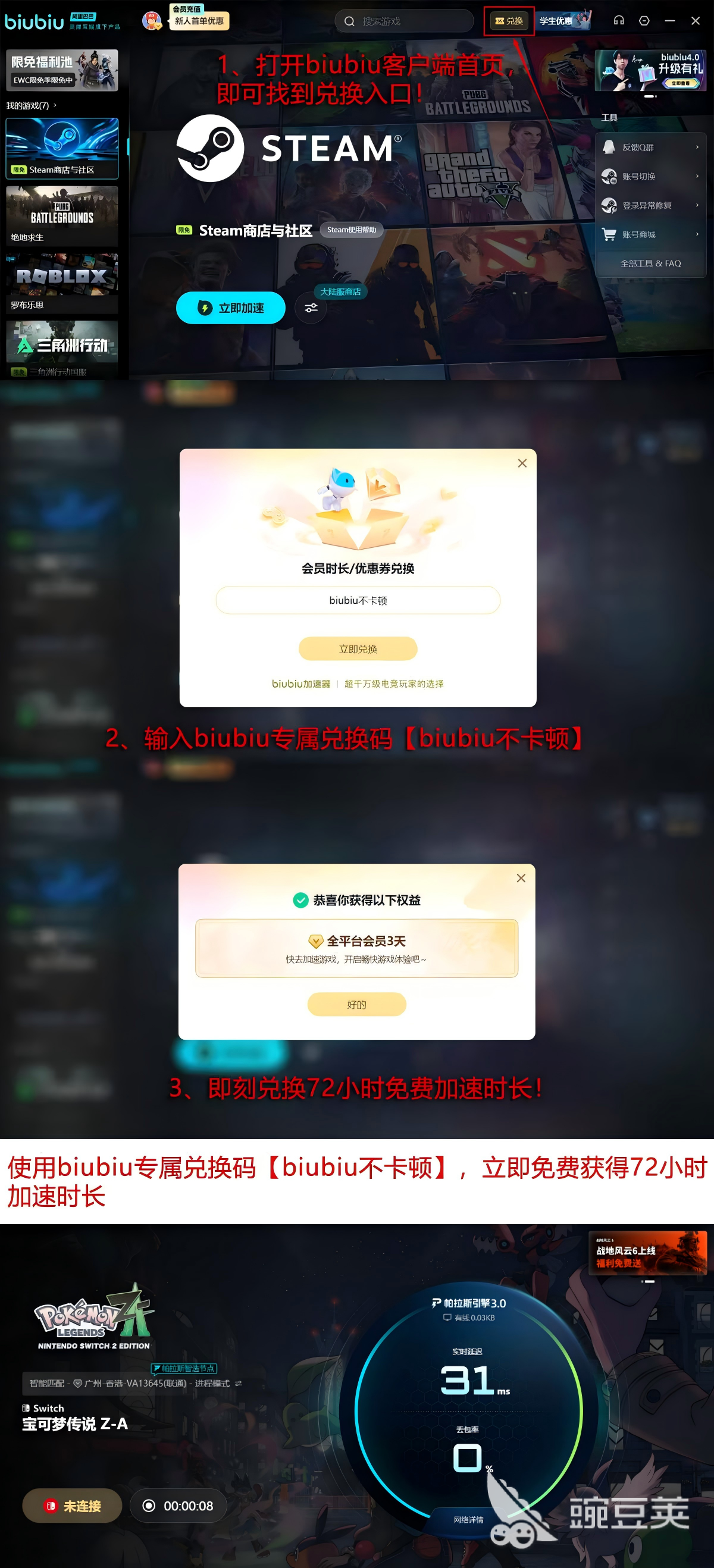 新用戶注冊(cè)即可享受多重福利:首次登錄將獲得24小時(shí)免費(fèi)專屬加速服務(wù),同時(shí)可使用【biubiu不卡頓】專屬口令兌換額外72小時(shí)加速時(shí)長(zhǎng),合計(jì)最高可達(dá)96小時(shí)的暢玩體驗(yàn),助力新手快速融入游戲世界。