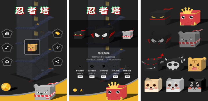 忍者塔的畫風(fēng)特別簡單,忍者是方塊造型,塔的每一層也都是由簡單的幾何圖形組成,玩起來特別輕松,核心玩法就是往上爬塔,用手指點擊屏幕控制忍者移動,左邊點一下就往左爬,右邊點一下就往右爬,還得避開每層的炸彈和陷阱,不同的裝扮還帶有不同的技能,選對裝扮能讓爬塔更順利。