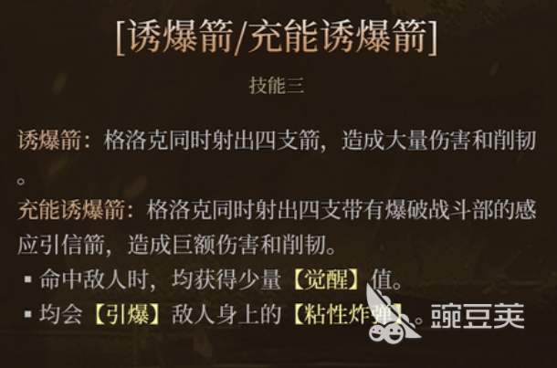 誘爆劍的效果就是在格洛克消耗了一枚炸彈之后,同時(shí)再射出6支爆炸箭,造成的傷害數(shù)值是非常高的,最后她還有一個(gè)技能3的效果是可以連續(xù)射出4支箭的,技能帶出大量的傷害和堅(jiān)韌效果,這里如果進(jìn)行攀升的話,后期還可以達(dá)到引爆的粘性炸彈的效果,在大招上面她帶來的是本身強(qiáng)化能力,此時(shí)會(huì)具有一只非常大的爆炸箭,這個(gè)爆炸箭擁有的威力,是根據(jù)格洛克的傷害數(shù)值以及固定全身數(shù)值進(jìn)行百分比加成的,也是目前她最好用的一個(gè)技能。