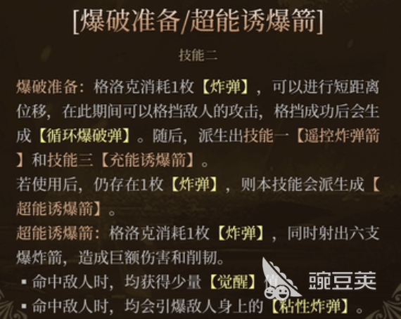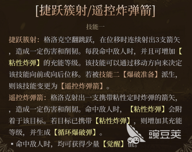 格洛克還有一個(gè)技能1,這個(gè)技能1使用的時(shí)候,格洛克可以進(jìn)行一個(gè)空翻跳躍的動(dòng)作,此時(shí)她也可以進(jìn)行一定的位移,在位移的同時(shí),它還可以繼續(xù)發(fā)射出來3支箭矢進(jìn)行輸出,這里造成的箭矢類型傷害都是遠(yuǎn)程輸出效果,并且還可以在上面造成一定的數(shù)值,在每一次命中敵人的時(shí)候,還可以根據(jù)這樣的效果來增加粘性炸彈的充能數(shù)值,這個(gè)技能后期其實(shí)也可以通過移動(dòng)的方向,來決定技能使用的位置在哪里,如果這個(gè)技能被技能2上面進(jìn)行派生的話,那么技能效果就會(huì)更換,變成一個(gè)遙控炸彈箭的效果。