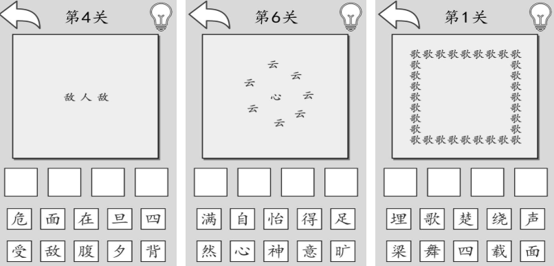 看字猜成語可以看做是看圖猜成語的簡化版作品,擁有灰色調(diào)的背景跟小清新的UI展現(xiàn),簡約文字?jǐn)⑹龅膱D片看上去更有辨識度,點(diǎn)觸選擇四個漢字組成成語的設(shè)定耐玩有趣,關(guān)卡多樣、解謎機(jī)制完善令成語愛好者沉浸,設(shè)有快節(jié)奏通關(guān)過程能快速理解所有成語的含義,列位猜成語系列游戲高手不妨挑戰(zhàn)本作。