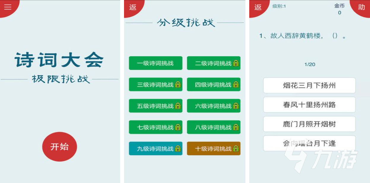 《詩詞大會》這款游戲一共有十個模式,從一級詩詞挑戰(zhàn)到十級詩詞挑戰(zhàn),而難度也會逐漸遞增,是一款非??简炘~匯量的游戲。游戲玩法特別簡單,就和上學時候做得選擇題一樣,而這款游戲主要是選擇一句詩詞的下半句,只有全部答對才可以順利通關(guān),獲得金幣,想要測試自己詩詞儲備量是否多的玩家就趕快下載吧。