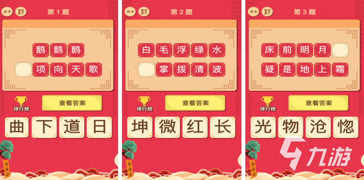 《詩詞大挑戰(zhàn)》也是一款詩詞類游戲,游戲中有上千首詩詞,且都分門別類,有五言詩、七言詩、樂府詩、五言詞、七言詞等多種模式,你可以根據(jù)自己的喜好或者對詩詞的掌握選擇一個模式挑戰(zhàn)。游戲玩法也很簡單,進入關(guān)卡后,屏幕上會出現(xiàn)很多單獨的字,而你只需要將這鞋子連成詩句即可通關(guān)!