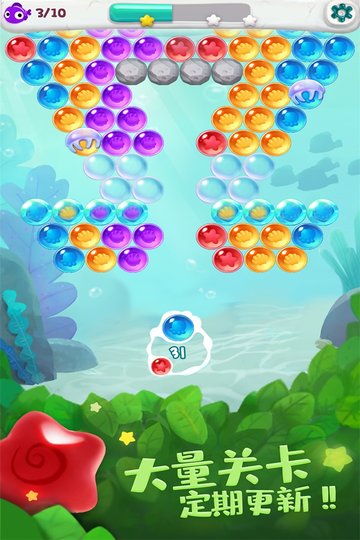 映入眼簾的是豐富的彩色小球,玩家可以通過發(fā)射小球找到與它顏色相同的小球區(qū)域進(jìn)行成功消除。找準(zhǔn)小球發(fā)射的位置,才能一次性消除更多數(shù)量的球球。這些小球會一直向下落,小球的數(shù)量會越來越多,消除的速度也要更快。豐富的闖關(guān)場景使畫風(fēng)變得更加有趣,消除泡泡的方式,還能夠解救那些被困的海洋生物。