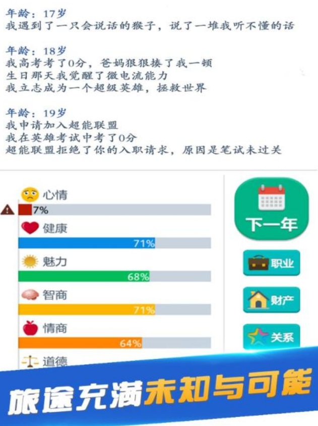 有著不錯模擬樂趣的文字類游戲,它能讓各位從出生開始,重新在游戲中去經(jīng)歷人生的各個階段,且在每一階段都將由人們自行去進行人生道路選擇。而游戲也會根據(jù)各位的選擇,去對角色往后的人生進行模擬,并且會把模擬結果完整地呈現(xiàn)給大伙,人們也能十分直觀地了解到自己的選擇會對人生造成什么樣的影響。它的劇本設計沒有任何的規(guī)律,隨機性也特別高,能讓各位在游玩時不斷體驗不同的精彩人生。