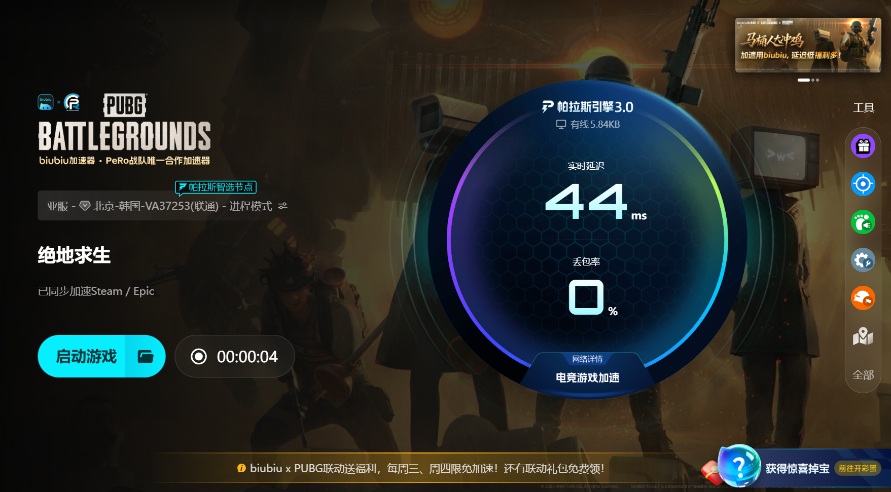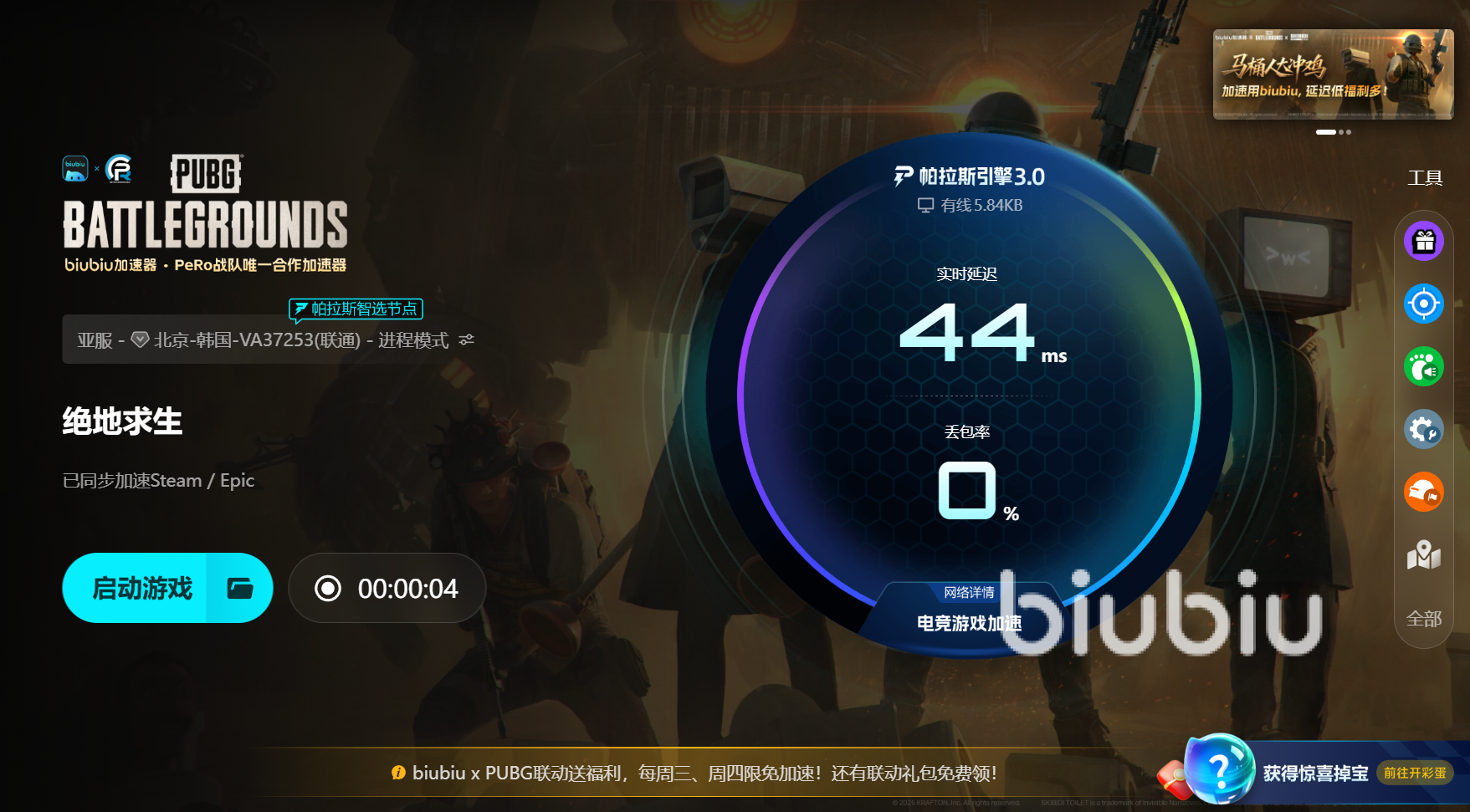 操作流程其實很省事。打開biubiu客戶端,搜索pubg找到專屬加速入口,點開啟加速就行,系統(tǒng)會自己測當前網(wǎng)絡狀態(tài),把線路壓到延遲最低、抖動最小的那個節(jié)點上,全程不需要手動挑線也不用去試哪個區(qū)快。加速保持開啟后再進游戲,大廳、匹配、地圖加載都會順起來。如果遇到的是晚高峰、賽季更新這種極端時段,也可以在專屬頁里換一下節(jié)點做補強,但默認智能選線就能應付大多數(shù)情況。