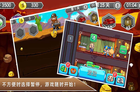 這款游戲的玩法繼承了經(jīng)典的黃金礦工,大家點一下屏幕鉤子就可以甩出去,不過大家需要求助于黃金再出手,這需要大家有預判的技能,多玩幾次就可以輕松上手,游戲里的道具特別多。炸彈可以炸開障礙可以幫到大家挖到更多的寶藏,鉆石的價值很高,挖到就是賺到,在玩的時候要十分留意道具合理的去利用他們,可以讓大家挖得更快賺得更多。