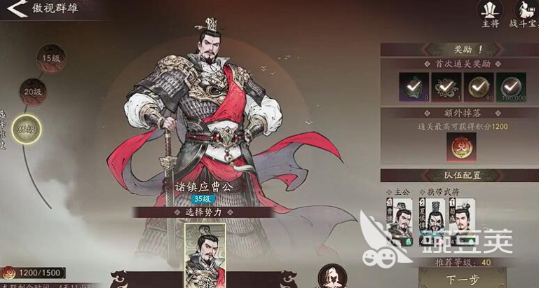 大家在其中進行挑戰(zhàn)的話,要先完成流寇清掃戰(zhàn)這個關(guān)卡,然后才可以解鎖傲視群雄,這里大家解鎖之后可以直接進入備戰(zhàn)的頁面,在備戰(zhàn)的頁面當(dāng)中,大家要首先挑選自己選擇的一個難度,目前從15級開始,大家就可以進行挑戰(zhàn),基本上是前期5級一個關(guān)卡,到20級之后就會10級一個關(guān)卡的挑戰(zhàn)區(qū)間,建議主公在達到了推薦等級之后再進行挑戰(zhàn),會有更高的武力數(shù)值去進行比拼,那么除了這里要選擇難度之外,然后也要挑選到3個武將進行隊伍配置。