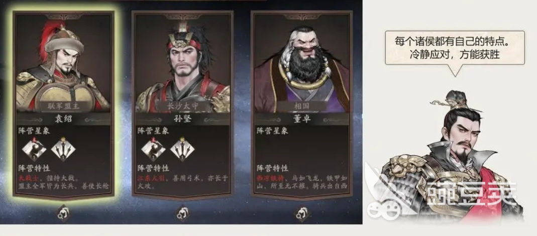 其次在形象選擇好之后,還要選擇自己即將要挑戰(zhàn)的諸侯,每一個諸侯都有自己的特點在上面,比如說如果選擇的是聯(lián)軍盟主袁紹的話,他為大家?guī)淼奶匦跃褪菚o槍類武將帶來足夠的增益,如果選擇的是董卓這類諸侯的話,那么他在上面帶來的騎兵能力是比較強的,這類諸侯都是大家可以選擇的對手,所以在這里選擇對手的方式還是比較自由的,后期在回合類型選擇上面,大家要看不同的3個回合類型選擇一個就可以了,每一次也只能選擇一個,其中會有不同的戰(zhàn)斗效果以及事件發(fā)生,休息的時候也會有不同的路線,大家選擇驛站前往就可以入城修整。