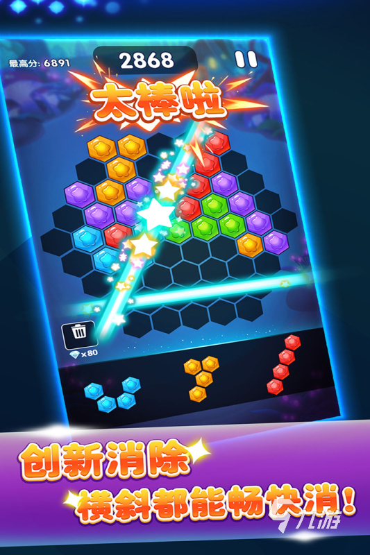 消除類型的游戲怎么能不給我們的玩家,推薦這款《六邊形消消消》手游呢?簡約的畫面風(fēng)格也是有著很優(yōu)秀的表現(xiàn),創(chuàng)新式的棋盤設(shè)計(jì)就讓玩家們大開眼界,超多的道具可以在關(guān)卡中進(jìn)行使用,玩家們還有不同的目標(biāo)可以去完成,盡情的挑戰(zhàn)我們的極限所在,看看最終到達(dá)的分?jǐn)?shù)如何呢。