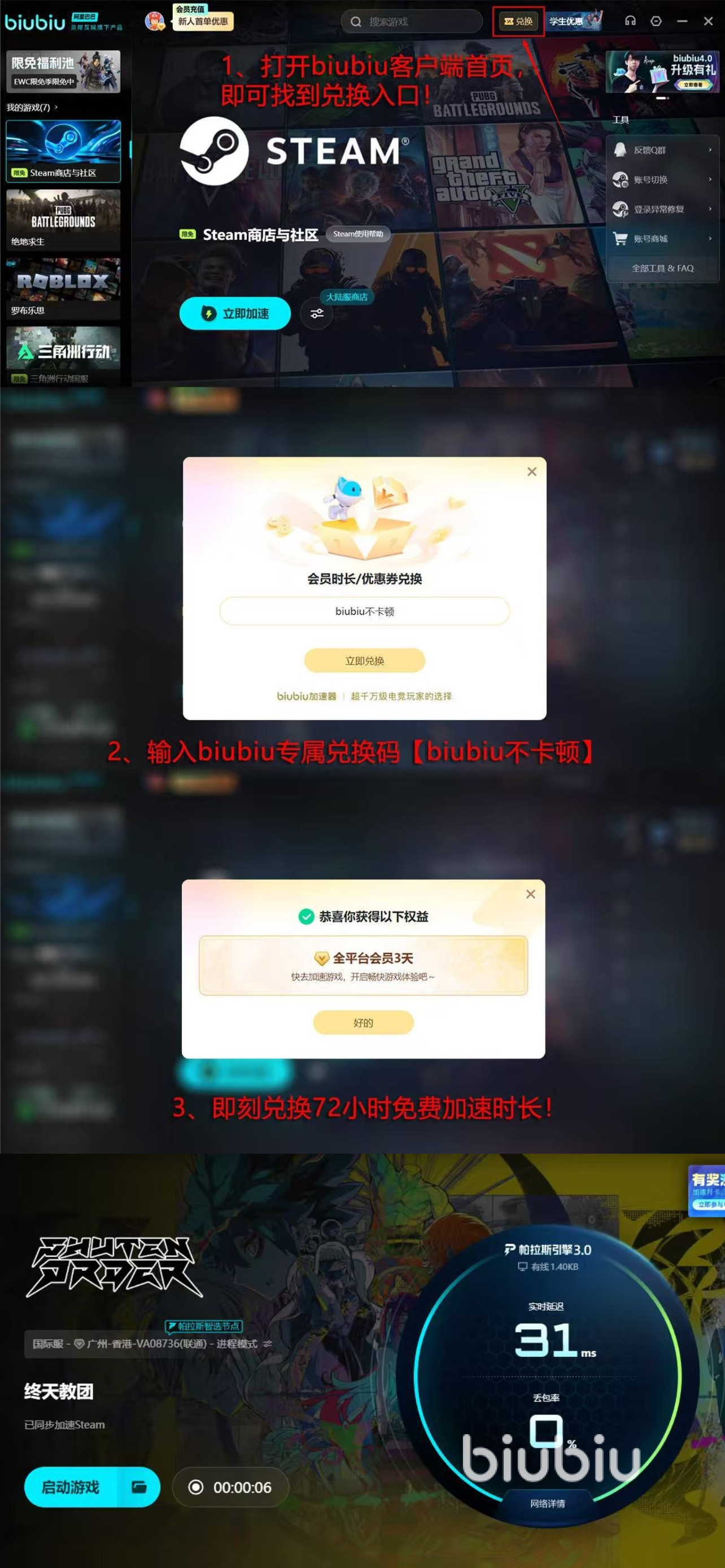 另外該加速軟件還為伙伴們準(zhǔn)備了很多的福利驚喜,比如第一次的注冊(cè)和登錄就可以拿到平臺(tái)贈(zèng)送的24h免費(fèi)優(yōu)化加速時(shí)間,結(jié)束了之后可以跟平臺(tái)的其他用戶一起帶著【biubiu不卡頓】,直接兌換到三天的繼續(xù)免費(fèi)加速時(shí)間。后期考慮充值的話,還有季卡,年卡,以及月卡三個(gè)選項(xiàng)等待大家來解鎖。