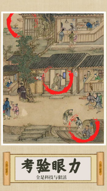 一款古代風(fēng)格設(shè)計的手游,把猜圖和找茬兩種模式結(jié)合,通過尋找現(xiàn)代的物品完成猜圖目標(biāo)。游戲每一關(guān)的畫面都包含美麗的古代建筑和時代特點,也在其中加入了籃球,奶茶,小提琴等元素,玩家需要仔細(xì)的思索古今區(qū)別即可過關(guān)。游戲難度使用階梯式的增長方式,對玩家的邏輯性和眼力有較多考驗,有時需要移動其他物品才能找到隱藏的線索。