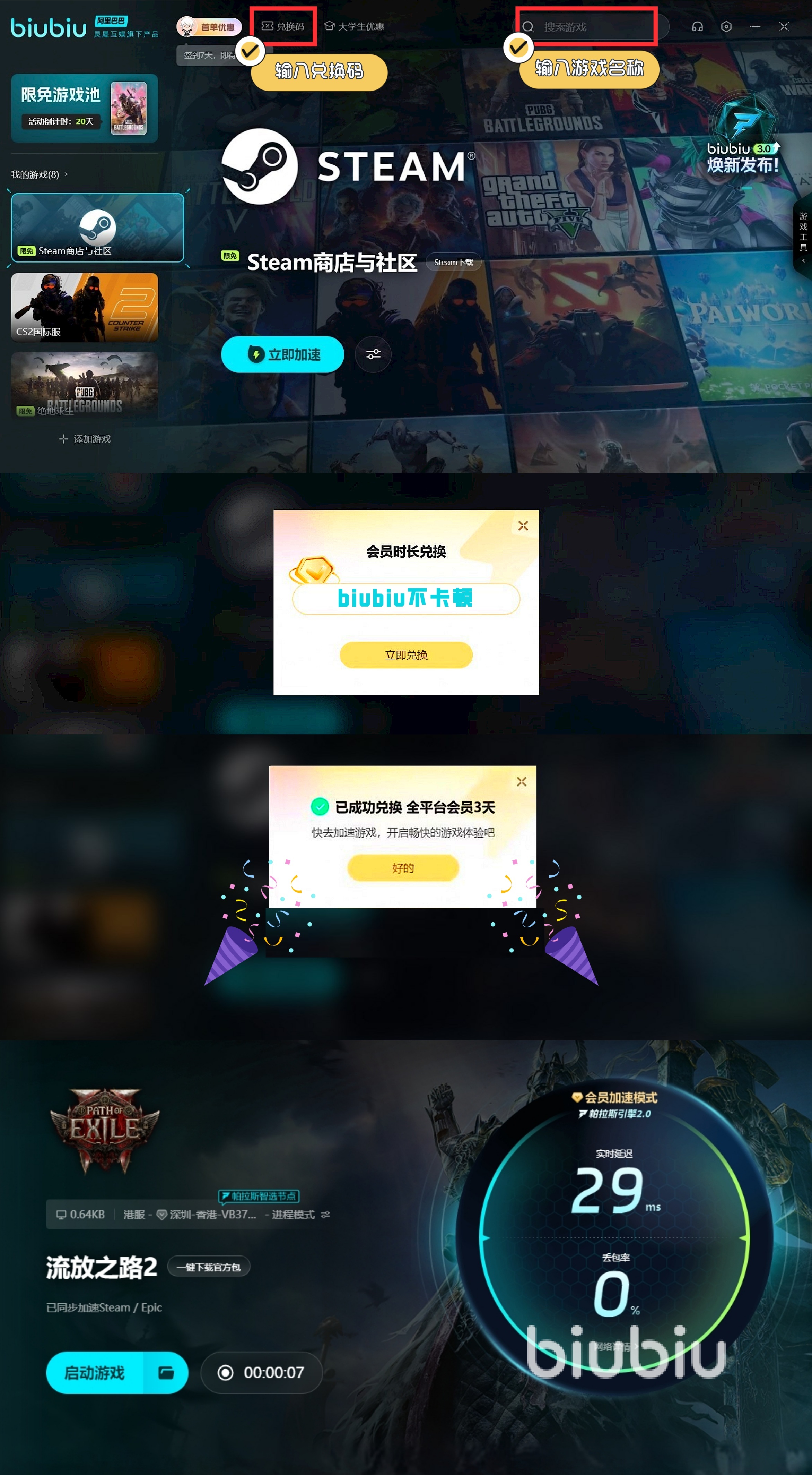 對(duì)于一些長時(shí)間體驗(yàn)的朋友而言,去選用biubiu來幫自己也很合適,畢竟目前所有平臺(tái)用戶到時(shí)都能在兌換界面,通過輸入【biubiu不卡頓】來順利領(lǐng)取72h的加速時(shí)長,助力自己更好的去體驗(yàn)它,而不用在擔(dān)心自身網(wǎng)絡(luò)方面會(huì)存在有延遲與卡頓影響。