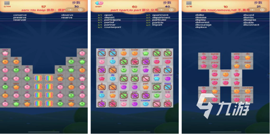 消消樂(lè)英語(yǔ)設(shè)計(jì),大膽創(chuàng)新,創(chuàng)意非凡。游戲玩法很新穎,將英語(yǔ)單詞分散開(kāi),玩家需對(duì)其進(jìn)行的一個(gè)組合,組成一個(gè)完整全新的單詞。游戲界面清新自然,單詞所在圖案也是精致無(wú)暇,設(shè)計(jì)者在圖案組成方式上也參考了俄羅斯方塊的擺放形式,給玩家一種眼前一亮的感受。