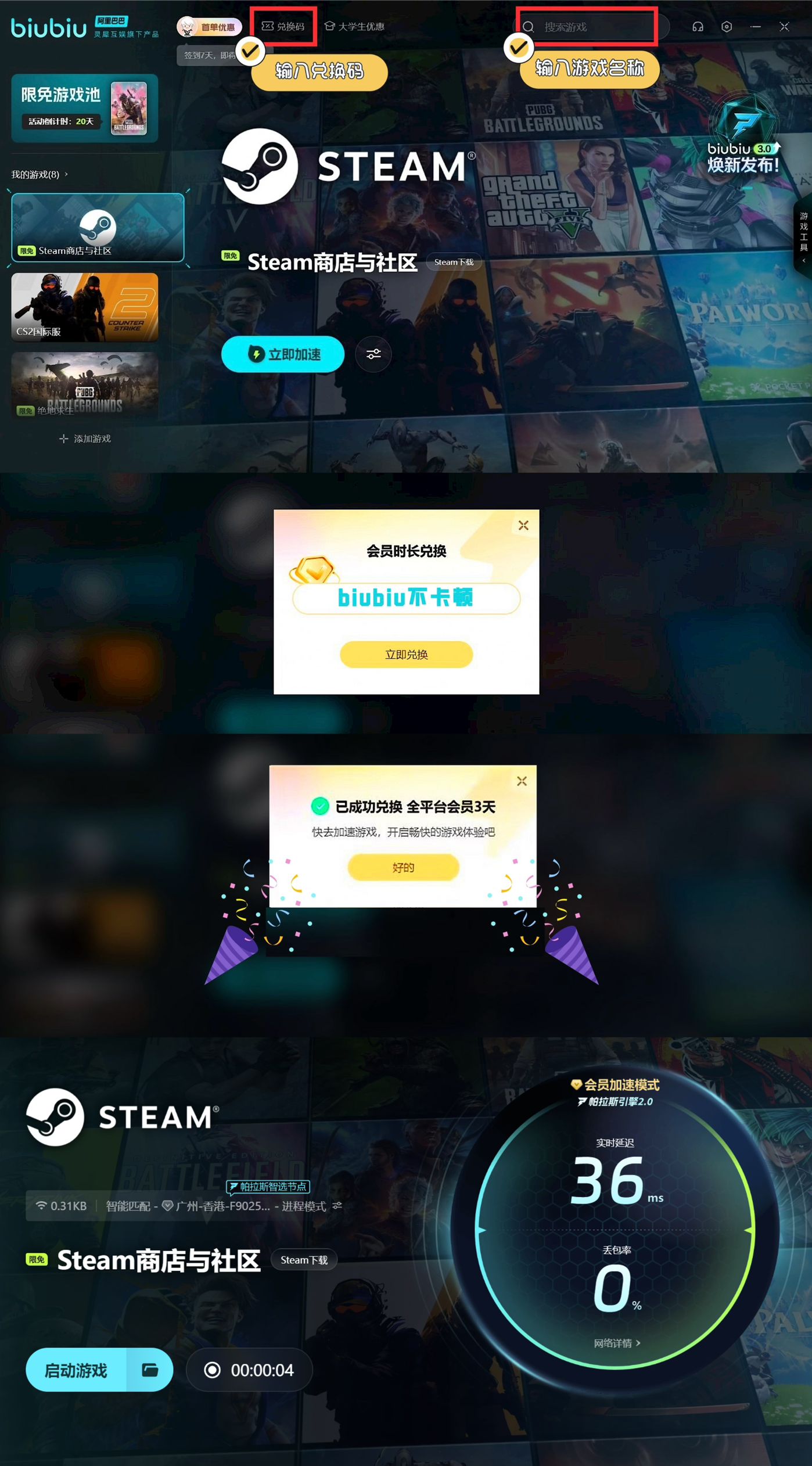 新用戶注冊還有福利可以拿呢!登錄就可以獲得3h小時的新人嘗鮮體驗!老用戶也別急,輸入【biubiu不卡頓】,就能額外兌換72小時加速時長!這福利簡直不要太爽!新用戶總共能享受75小時加速時長,讓你可以盡情的沉浸在戰(zhàn)斗當中不會受到任何的打擾。